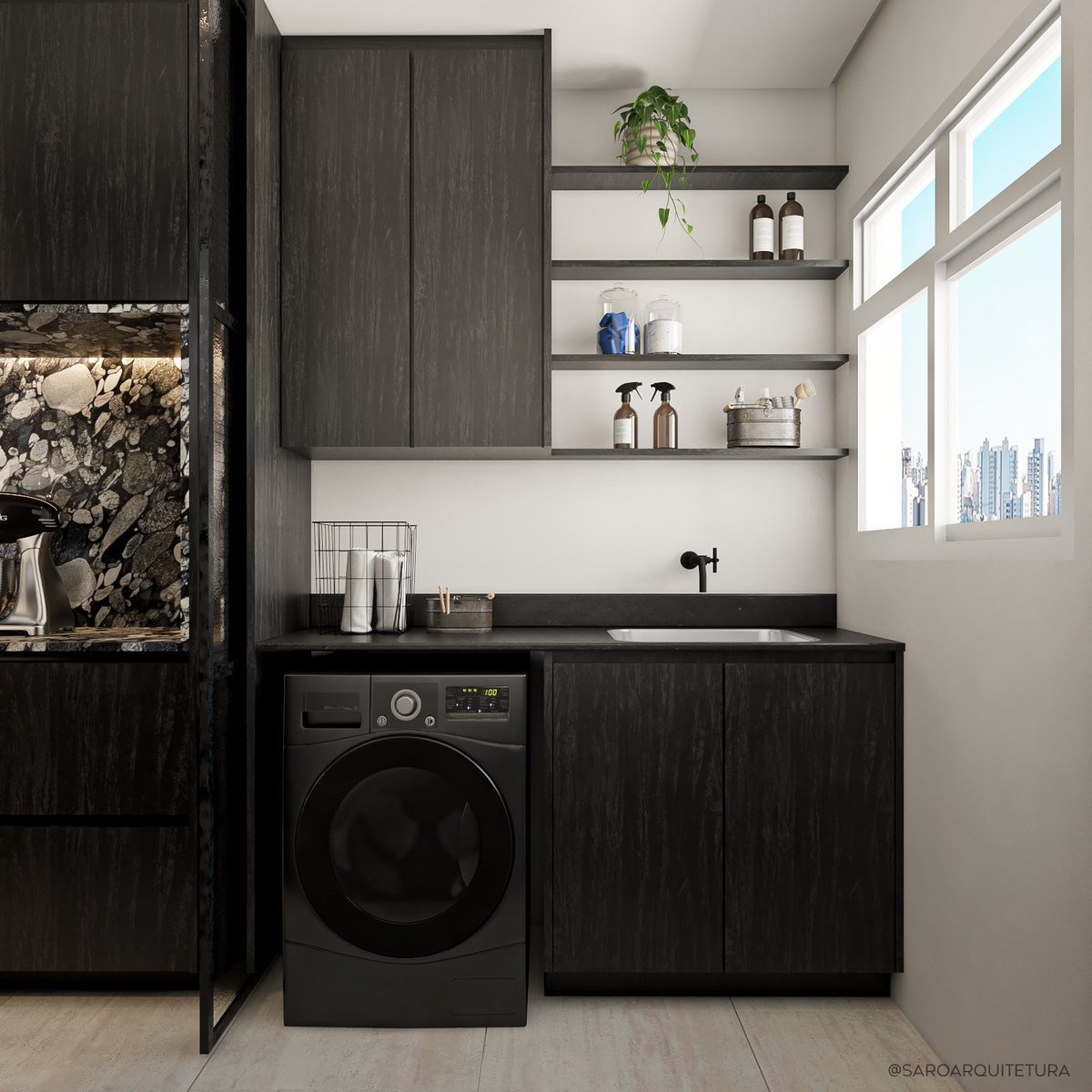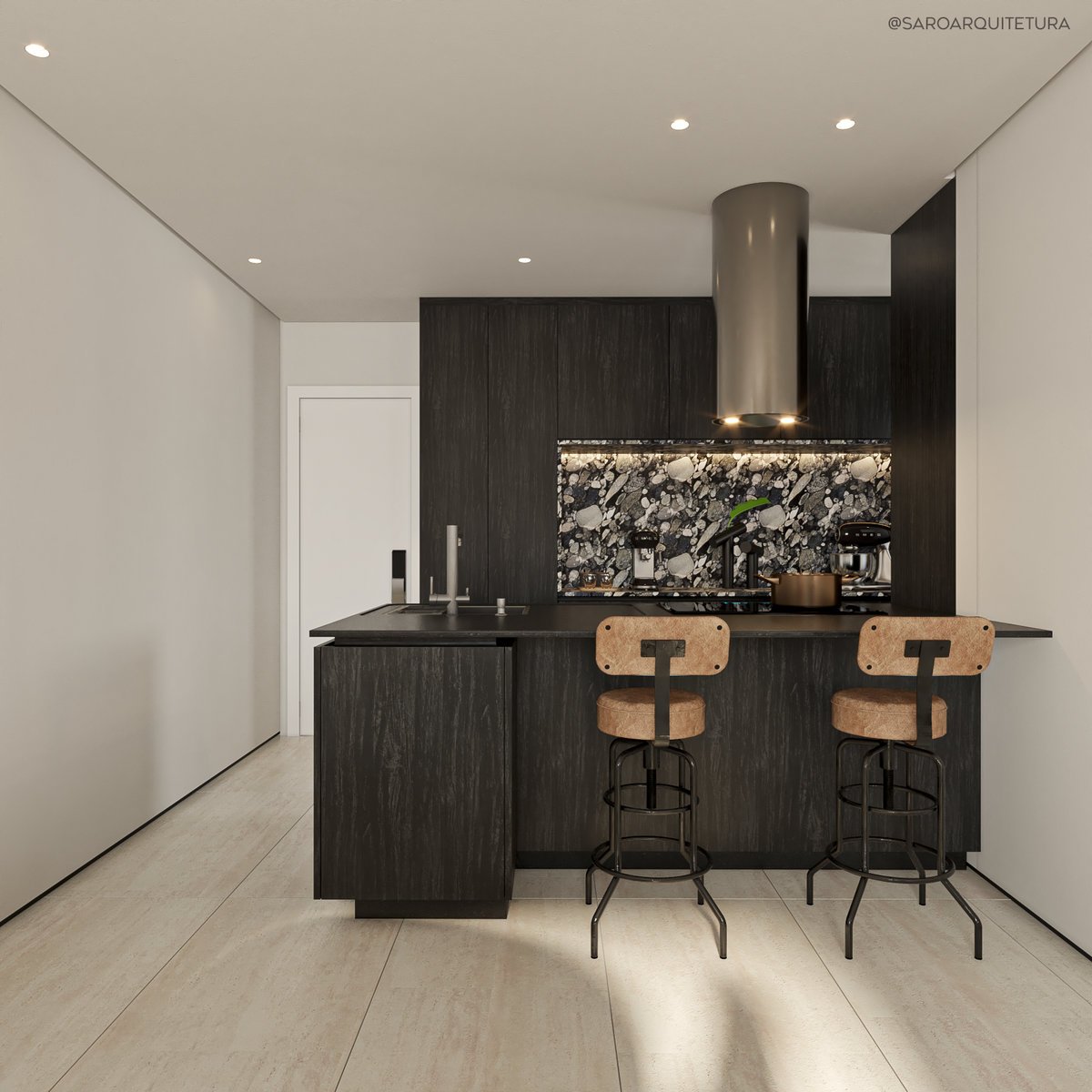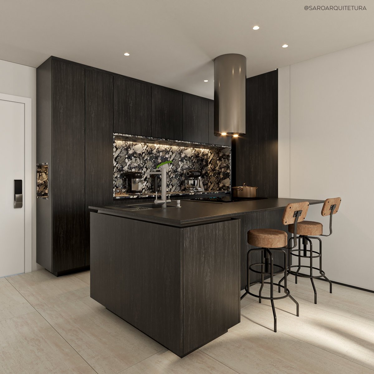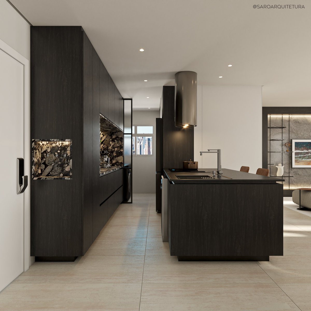 O grande destaque visual fica por conta do Quartzito Black Marinace, uma pedra brasileira extraída principalmente da região do Espírito Santo. Conhecida por sua resistência e beleza, essa pedra traz ao nicho da cozinha uma personalidade marcante e uma beleza natural única, com veios escuros e texturas sofisticadas que enriquecem o projeto.