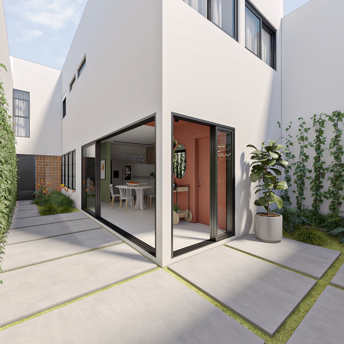 A fachada foi completamente redesenhada, priorizando a privacidade em relação à rua, sem abrir mão de uma estética moderna. O resultado é uma residência urbana que alia praticidade, aconchego e o prazer de viver em um ambiente que valoriza a natureza e os vínculos familiares.